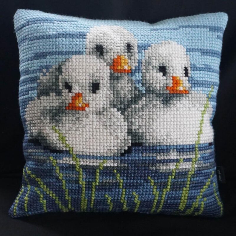 Andarungar– útsaumað í grófan java með akrýlgarni. Bak er úr bláu bómullarefni.
