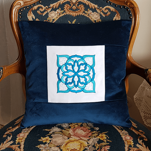 Bláklukka er með blágrænum útsaumi á hvítu hör efni. Bak og umgjörð er úr blágrænu flaueli, einnig hægt að fá með svörtu baki.