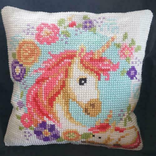 Einhyrningur– útsaumað í grófan java með akrýlgarni. Bak er úr fjólubláu bómullar flaueli.