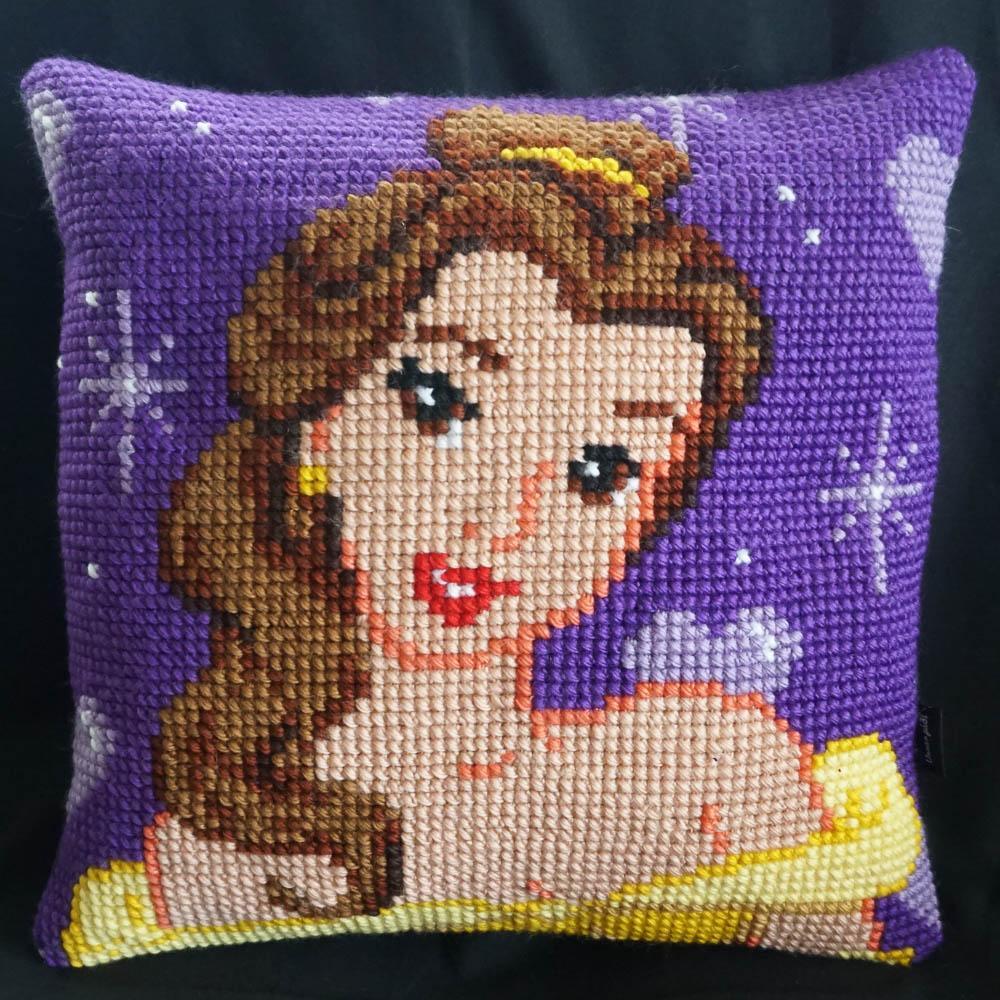 Fríða – útsaumað í grófan java með akrýlgarni. Bak er úr fjólubláu bómullar flaueli.