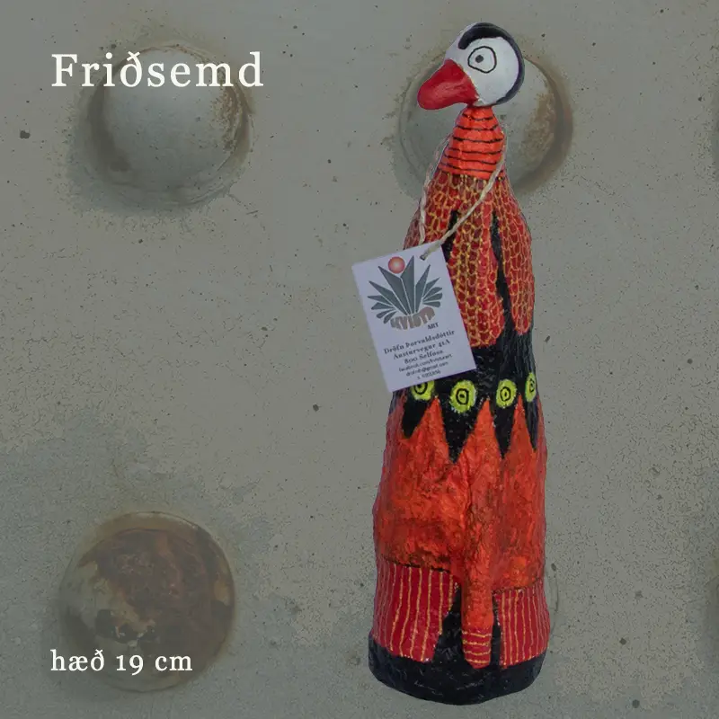 Mörgæs úr pappírsmassa. Annað efni: leir. Hæð 19 cm.