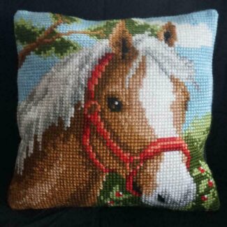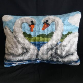 Fuglar og rósir – útsaumað í grófan java með akrýlgarni. Bak er úr grænu bómullarefni.