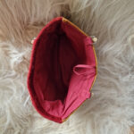 Falleg handtaska saumuð af Unni, þessi fallega taska er fóðruð að innan með rauðu efni og er með karrýgult bak úr flaueli.