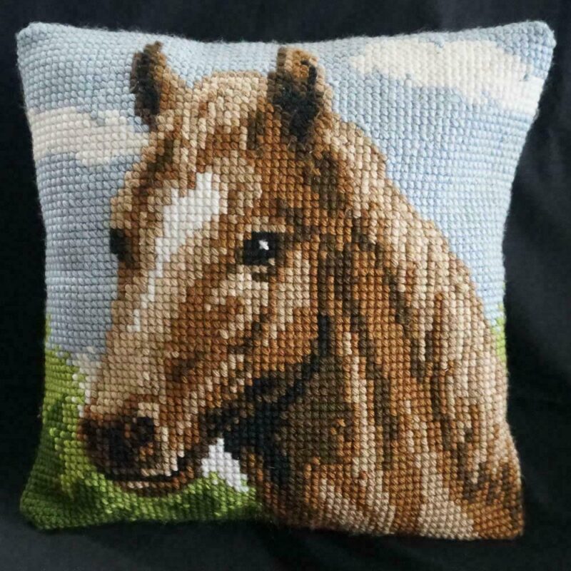 Hestur – útsaumað í grófan java með akrýlgarni. Bak er úr grænu bómullarefni.
