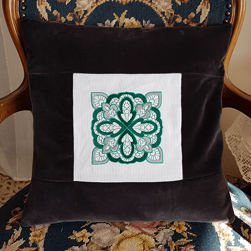 Holtasóley er með Emerald grænum útsaumi á hvítu hör efni. Hægt er að velja bak og umgjörð úr Emerald grænu flaueli eða umgjörð úr Emerald grænu flaueli og bak úr svörtu flaueli.