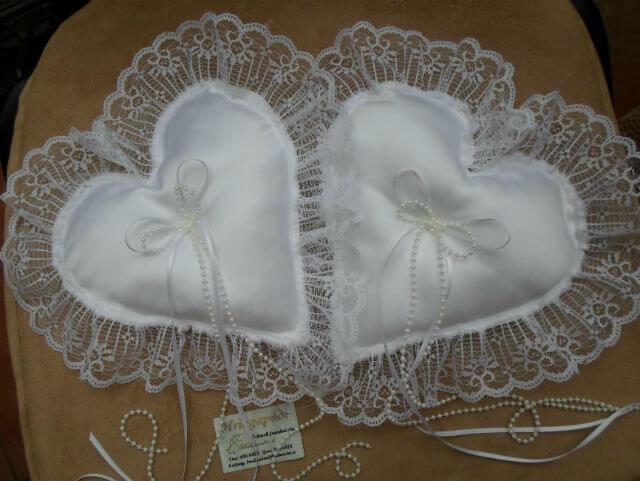 Hjartalaga hringapúða par. Hægt er að velja milli blúndkants eða perlukants (sjá myndir).