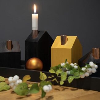 Húsin eru unnin úr endurunnu límtré. Þau eru máluð með koparstromp og eru 4 saman í pakka.