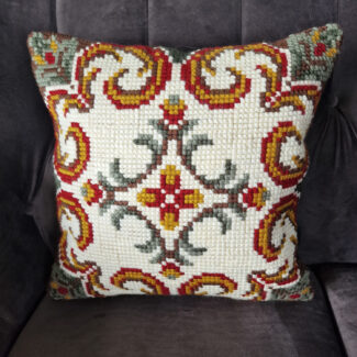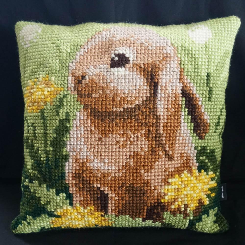 Kanína – útsaumað í grófan java með akrýlgarni. Bak er úr grænu bómullarefni.