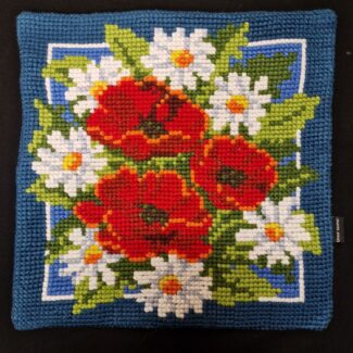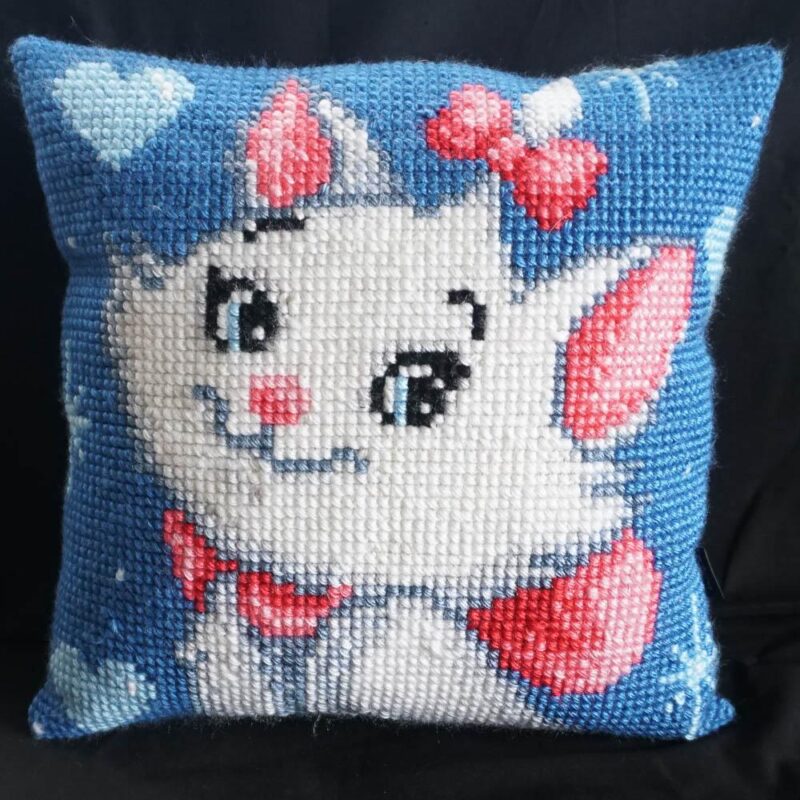 Hefðar kisa með slaufu – útsaumað í grófan java með akrýlgarni.  Bak er úr bláu bómullarefni.