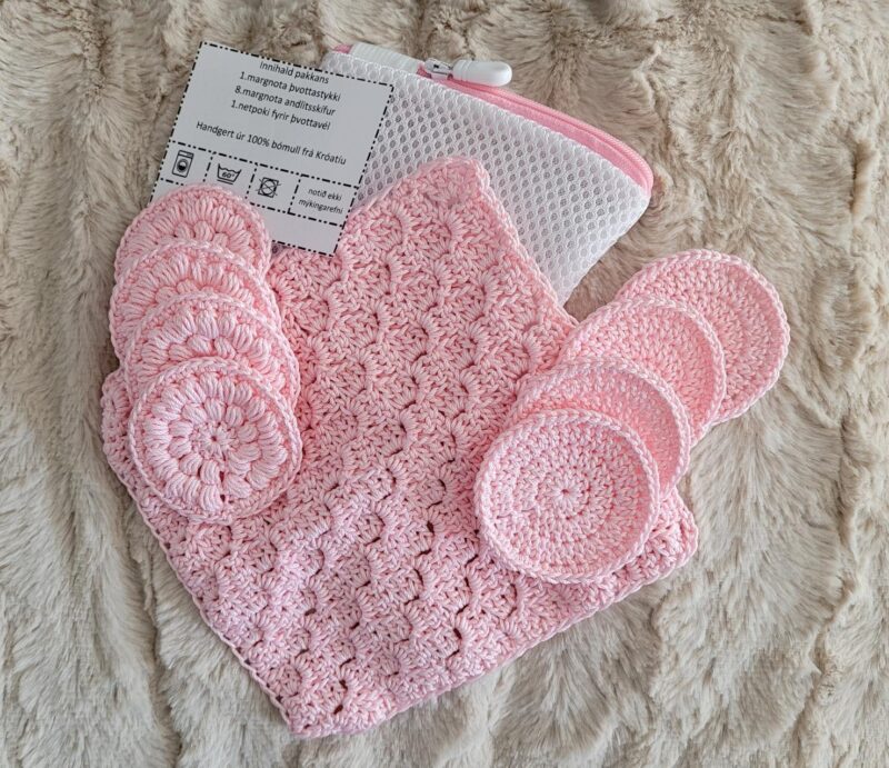 Innihald pakkans: 8 stk andlitsskífur, 1 stk þvottastykki1 stk netpoki fyrir þvottavélina, þvottaleiðbeiningar.