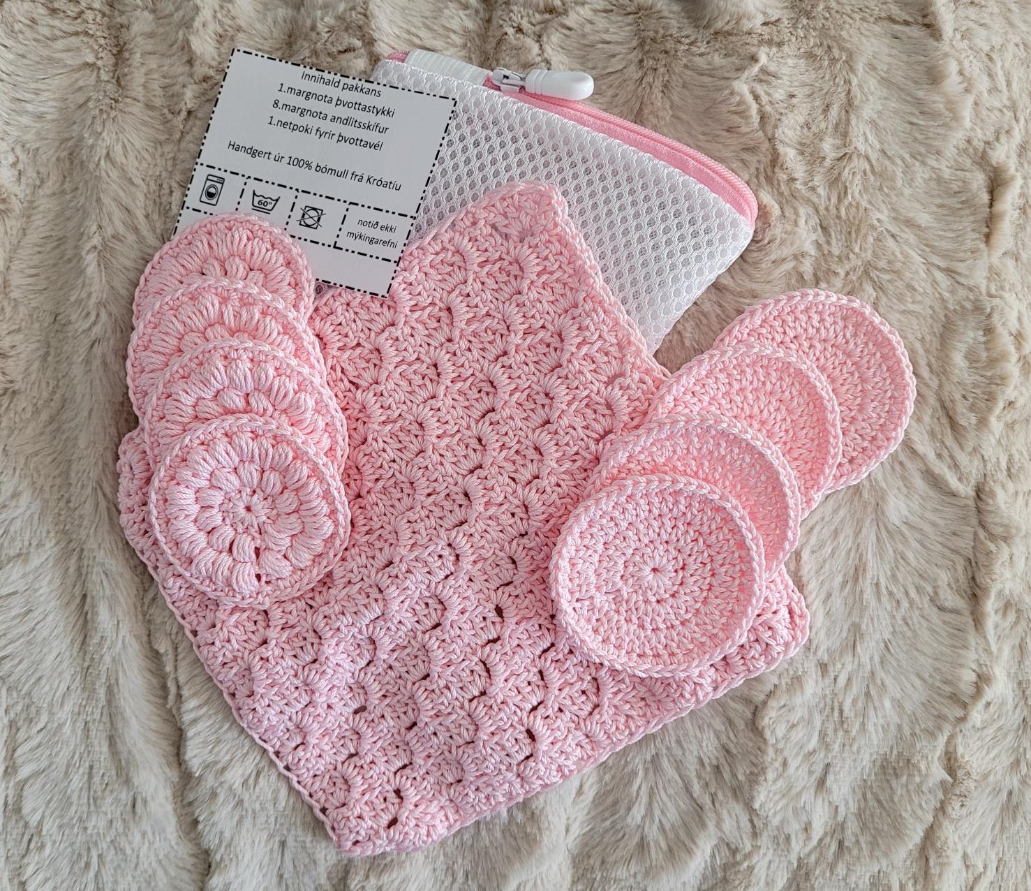 Dásamleg gjöf. 8 margnota andlitsskífur, 1 þvottastykki handgert úr 100% bómull ásamt netpoka.