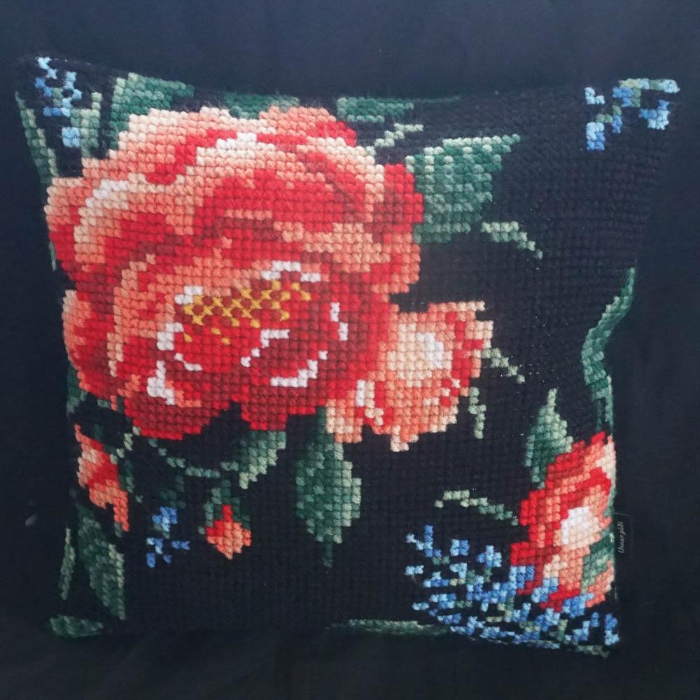 Rós á svörtum grunni– útsaumað í grófan java með akrýlgarni. Bak er úr svörtu bómullar flaueli.