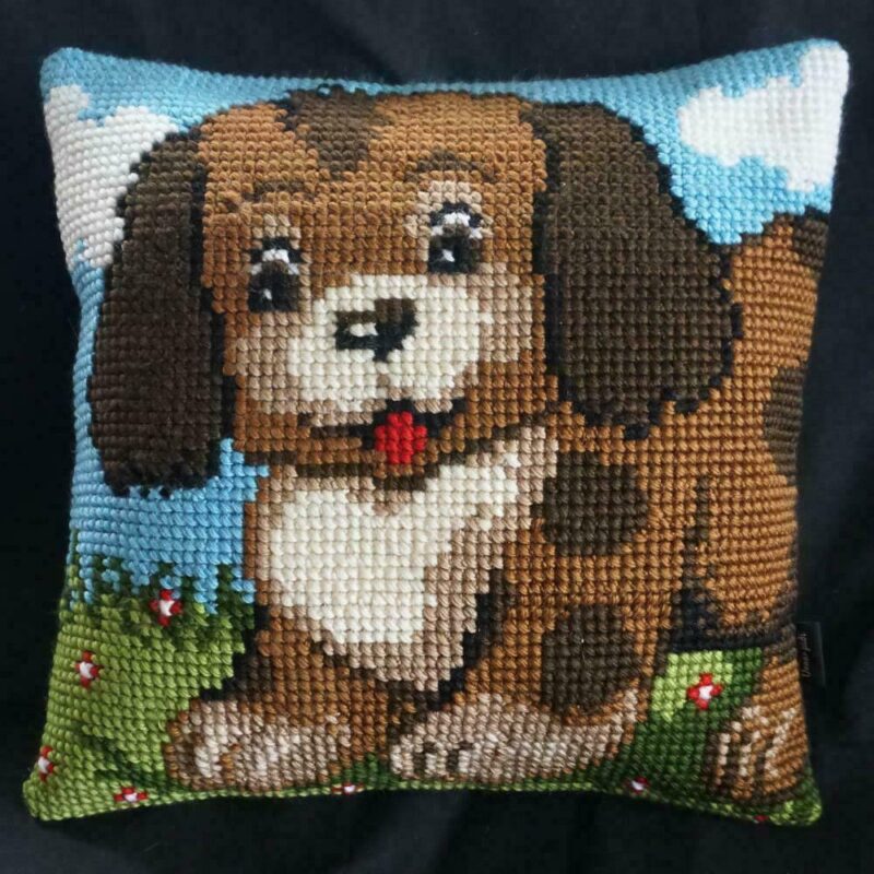 Seppi – útsaumað í grófan java með akrýlgarni. Bak er úr grænu bómullarefni.