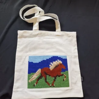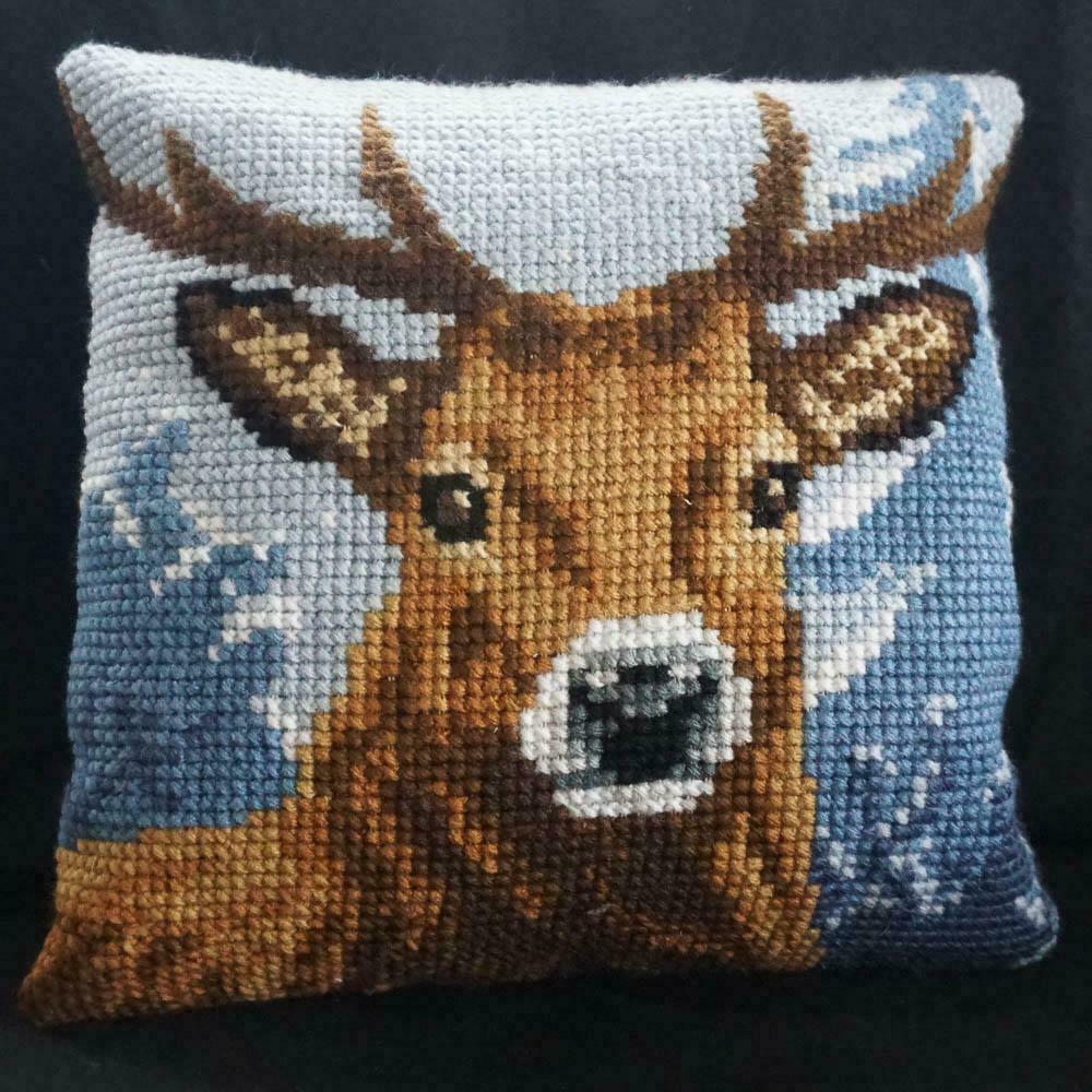 Hreindýrs tarfur – útsaumað í grófan java með akrýlgarni. Bak er úr bláu bómullarefni.