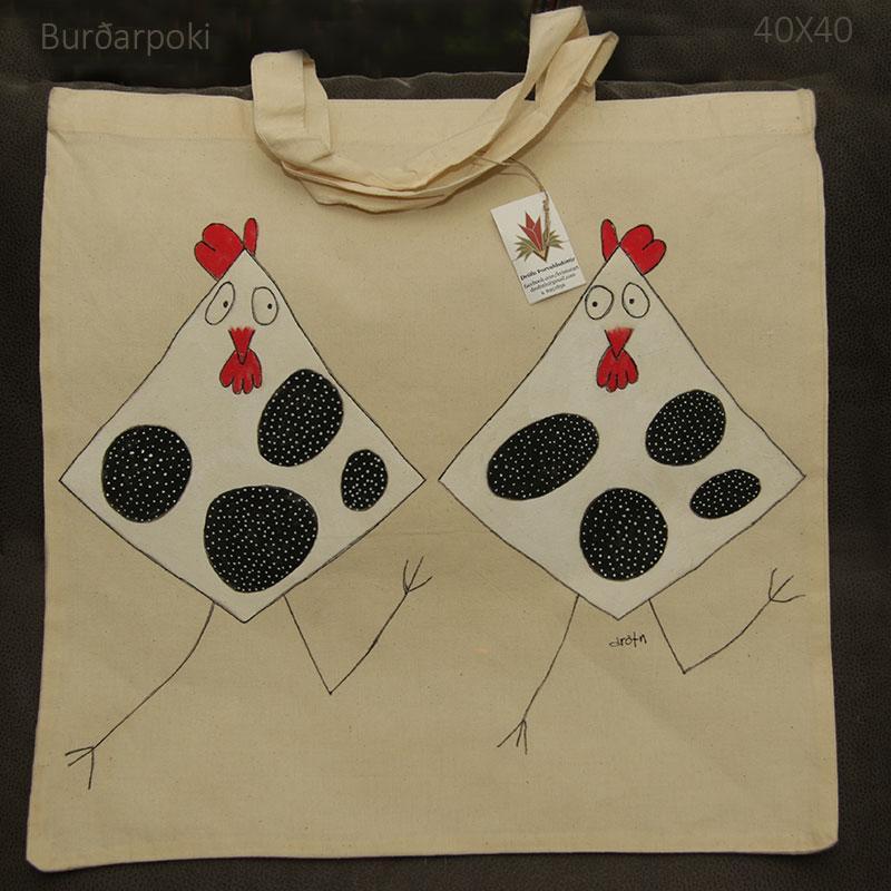 Hér er um að ræða taupoka sem eru 40×40 cm að stærð. Á þá eru málaðar, með akryl málningu, myndir af ýmsu tagi.